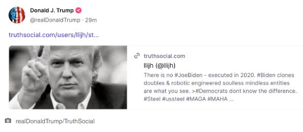 Just to be clear, this is a screen capture from a news article reporting on the post, and not me “stalking” the President. You know, if this was from any other person, especially the lying liberal media or the lunatic Jake Tapper’s book, I would say it’s fake news from the fake media. But how can I say that about a post from the leader of the free world himself? And come to think about it, it does explain somethings that I have been wondering about for the past several months. I was never able to reconcile Biden’s horrible performance during that debate with the energy and coherence in a speech he gave the next day. Now I understand. It was just a malfunction of a crappy robotic clone.
